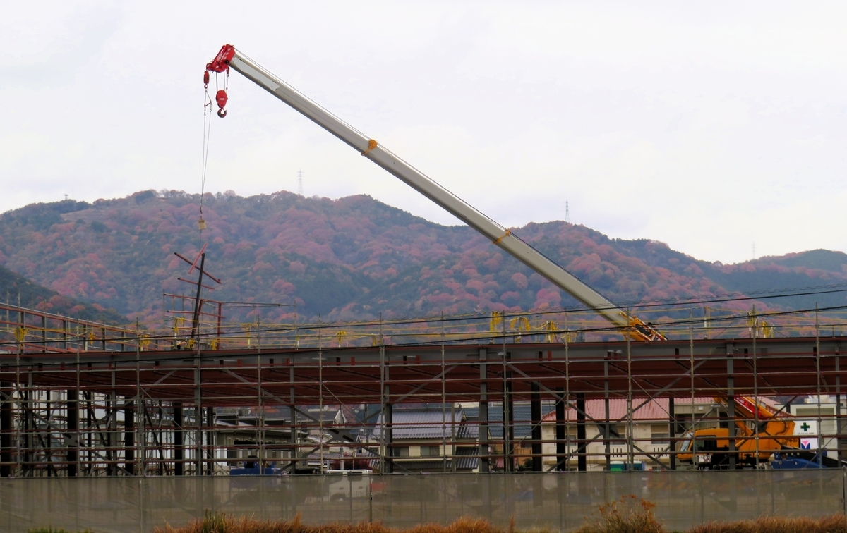 その上空の下、僅かに残された田んぼの北では、建築工事が着々と進んでいる。