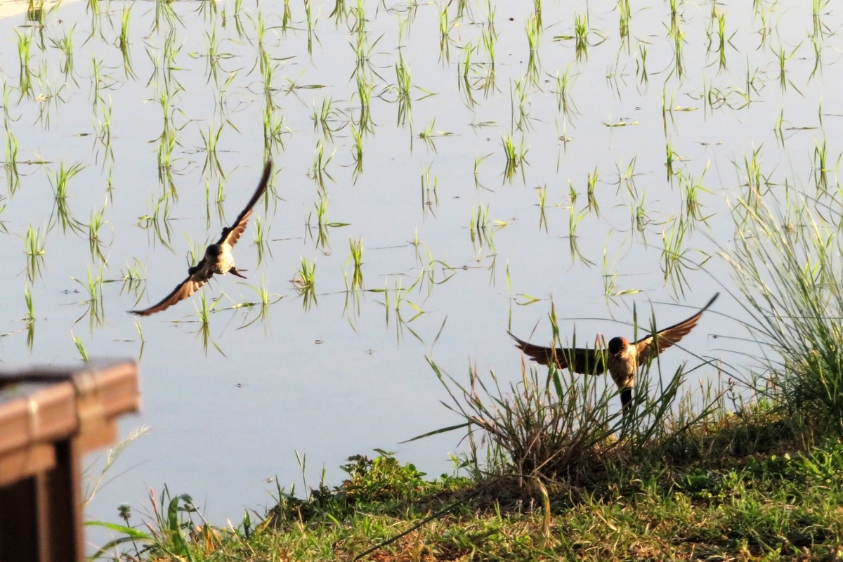 「コシアカツバメ」は、この時期でも、せっせと田んぼの泥を口に食わえて巣作りをしている。朝方は、特に数羽が頻繁に巣と田んぼとの行き来している。ただ、巣がどこかは分からない。